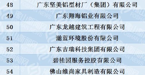 12月17日,佛山市企业联合会、佛山市企业家协会首次发布佛山企业100强榜单。该榜单以2018年企业营业收入为基本标准,综合考虑企业经营指标而得出。榜单的上榜门槛是27亿元,百强企业总营收达到13463.6亿元。 翔海铝业位居49名。 原文来源 搜狐新闻